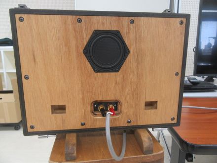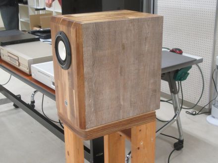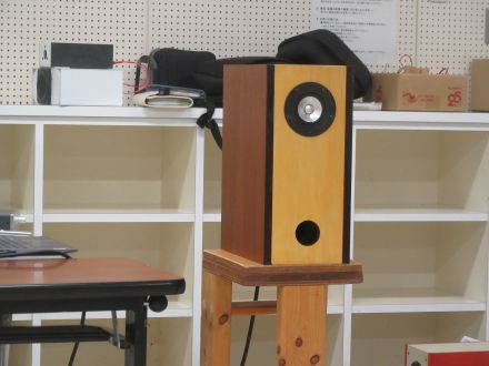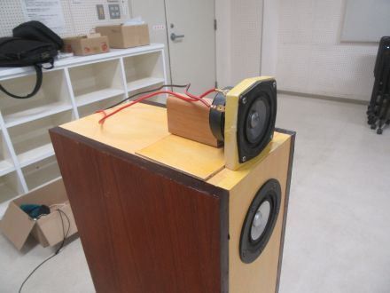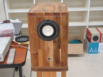 も う1機種、スキャンスピークの110F/8422-03でBHBSを 作った。これは第147回 でも作ったが今回の方が箱が大きく、低音が伸びた。5cm 5F/8422T03の フルレンジはキャビネッとの上に載せて1.5μF で切って裸で鳴らす。マグネット後ろをタモの棒で支えて慣性質量を大きくしている。音は上に延びて精緻な音場と空気感が現れる。ひとつ発見があっ て、自宅のオーディオルームではもっと音場が濃密なのだ。裸のツイーターの高音は部屋の壁の反射もあいまって音場を作っているのだ。研修室では部 屋が広いので自宅よりは濃密な音場感は薄れている。
