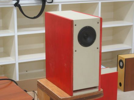 楠 さんはコンテストのバックアップ機Light-2を持参。ユニットはfostexのPT-20とP1000。 両者のf特 を測定してクロスを決定。PT-20は取り付けフランジを外 しキャビネットに直付け、f特から計算して2μFで ローカット。P1000は ツイーターと能率を合わせる目的でコーンに質量を付加した上で鉄芯入りの2.2mHコ イルを入れている。キャビネットはツイーターとウーファは別ボックスで素材はアルミとプラスチック板のサンドイッチ。音はというと高い方にかけて早めに切れて 素っ気 ない印象。低音も出てはいない。楠さんが測定したf特はフラットであるが、そう は聴こない。素のユニットの生き生きしたところがすべて削られてしまった感じだ。